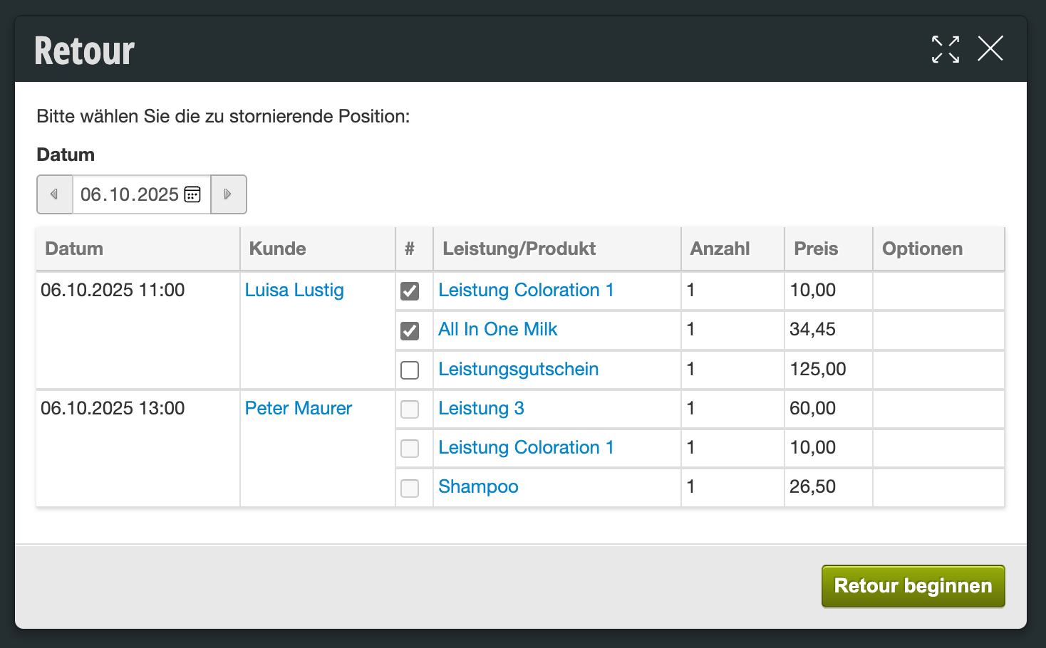 Beachten Sie, dass die Retoure nur für einen Termin möglich ist und nicht von unterschiedlichen Terminen gleichzeitig retourniert werden kann.